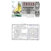 - Décimo "Especial do Turista" da Lotaría Nacional de 1978 co motivo "Os Recursos naturais": imaxe que representa un barco navegando a vela. O número do décimo é o 76218 / ANVERSO. Impresión / 76218 / Lotería Nacional. Décima parte del billete para el sorteo del día 16 de septiembre de 1978 / El jefe del servicio (sinatura) / 3680707 - 076218 / 36/78 / 7ª fracción / 7ª serie / Precio 500 pesetas / Navegación a vela (imaxe) / Séptima fracción / Fca. Nal. de Moneda y Timbre / REVERSO. Impresión / Sorteo del día 16 de septiembre 1978. Sistema moderno. Extraordinario del turista. 8 series de 80.000 billetes de 5.000 pesetas. (Resumo de premios) / Extracto de la instrucción de Loterías (imaxe) / Próximo sorteo: 23 de septiembre. Billetes de 1.000 ptas., en décimos de 100 ptas