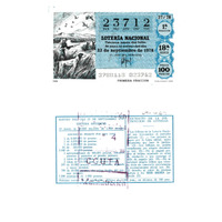 - Décimo da Lotaría Nacional de 1978 co motivo "Os Recursos naturais": imaxe que representa unha escena de caza. O número do décimo é o 23712 / ANVERSO. Impresión / 23712 / Lotería Nacional. Décima parte del billete para el sorteo del día 23 de septiembre de 1978 / El jefe del servicio (sinatura) / 3780118 - 023712 / 37/78 / 1ª fracción / 18ª serie / Precio 100 pesetas / Caza (imaxe) / Primera fracción / Fca. Nal. de Moneda y Timbre / REVERSO. Impresión / Sorteo del día 23 de septiembre 1978. Sistema moderno. 19 series de 80.000 billetes de 1.000 pesetas. (Resumo de premios) / Extracto de la instrucción de Loterías (texto) / Próximo sorteo: 30 de septiembre. Billetes de 1.000 ptas., en décimos de 100 ptas