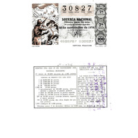 - Décimo da Lotaría Nacional de 1978 co motivo "Os Recursos naturais": imaxe que representa unha escena de caza maior. O número do décimo é o 30827 / ANVERSO. Impresión / 30827 / Lotería Nacional. Décima parte del billete para el sorteo del día 25 de noviembre de 1978 / El jefe del servicio (sinatura) / 4680707 - 030827 / 46/78 / 7ª fracción / 7ª serie / Precio 100 pesetas / Caza mayor (imaxe) / Séptima fracción / Fca. Nal. de Moneda y Timbre / REVERSO. Impresión / Sorteo del día 25 de noviembre 1978. Sistema moderno. 17 series de 80.000 billetes de 1.000 pesetas. (Resumo de premios) / Extracto de la instrucción de Loterías (texto) / Próximo sorteo: 2 de diciembre. Billetes de 2.000 ptas., en décimos de 200 ptas