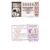 - Décimo da Lotaría Nacional de 1978 co motivo "Os Recursos naturais": imaxe que representa unha mina de sal xema. O número do décimo é o 06088 / ANVERSO. Impresión / 06088 / Lotería Nacional. Décima parte del billete para el sorteo del día 9 de diciembre de 1978 / El jefe del servicio (sinatura) / 4880804 - 006088 / 48/78 / 8ª fracción / 4ª serie / Precio 100 pesetas / Mina de sal gema (imaxe) / Octava fracción / Fca. Nal. de Moneda y Timbre / REVERSO. Impresión / Sorteo del día 9 de diciembre de 1978. Sistema moderno. 17 series de 80.000 billetes de 1.000 pesetas. (Resumo de premios) / Extracto de la instrucción de Loterías (texto) / Próximo sorteo: 16 de diciembre. Billetes de 1.000 ptas., en décimos de 100 ptas
