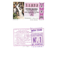 - Décimo "Extraordinario de Nadal" da Lotaría Nacional de 1977 co motivo "Os Recursos naturais": imaxe que representa un manancial de auga. O número do décimo é o 11492 / ANVERSO. Impresión / 11492 / Lotería Nacional. Décima parte del billete para el sorteo del día 22 de diciembre de 1978 / El jefe del servicio (sinatura) / 5080803 - 011492 / 50/78 / 8ª fracción / 3ª serie / Precio 2.000 pesetas / Manantial de agua (imaxe) / Octava fracción / Fca. Nal. de Moneda y Timbre / REVERSO. Impresión / Sorteo del día 22 de diciembre 1978. Sistema tradicional. Extraordinario de Navidad. 27 series de 65.000 billetes de 20.000 pesetas. (Resumo de premios) / Extracto de la instrucción de Loterías (texto) / Próximo sorteo: 5 de enero. Billetes de 10.000 ptas., en décimos de 1.000 ptas
