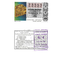 - Décimo da Lotaría Nacional de 1979 co motivo "Sistemas de transportes": imaxe que representa un resto arqueolóxico cunha escena cun carro de felinos. O número do décimo é o 73353 / ANVERSO. Impresión / 73353 / Lotería Nacional. Décima parte del billete para el sorteo del día 3 de febrero de 1979 / El jefe del servicio (sinatura) / 0590904 - 073353 / 5/79 / 9ª fracción / 4ª serie / Precio 200 pesetas / Carro de los felinos (imaxe) / Novena fracción / Fca. Nal. de Moneda y Timbre / REVERSO. Impresión / Sorteo del día 3 de febrero de 1979. Sistema moderno. 14 series de 80.000 billetes de 2.000 pesetas. (Resumo de premios) / Extracto de la instrucción de Loterías (texto) / Próximo sorteo: 10 de febrero. Billetes de 5.000 ptas., en décimos de 500 ptas