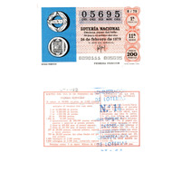 - Décimo da Lotaría Nacional de 1979 co motivo "Sistemas de transportes": imaxe que representa unhas rodas primitivas. O número do décimo é o 05695 / ANVERSO. Impresión / 05695 / Lotería Nacional. Décima parte del billete para el sorteo del día 24 de febrero de 1979 / El jefe del servicio (sinatura) / 0890111 - 005695 / 8/79 / 1ª fracción / 11ª serie / Precio 200 pesetas / Ruedas primitivas (imaxe) / Primera fracción / Fca. Nal. de Moneda y Timbre / REVERSO. Impresión / Sorteo del día 24 de febrero de 1979. Sistema moderno. 14 series de 80.000 billetes de 2.000 pesetas. (Resumo de premios) / Extracto de la instrucción de Loterías (texto) / Próximo sorteo: 3 de marzo. Billetes de 2.000 ptas., en décimos de 200 ptas