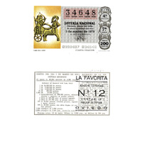 - Décimo da Lotaría Nacional de 1979 co motivo "Sistemas de transportes": imaxe que representa unha figuriña dun carro real asirio. O número do décimo é o 34648 / ANVERSO. Impresión / 34648 / Lotería Nacional. Décima parte del billete para el sorteo del día 3 de marzo de 1979 / El jefe del servicio (sinatura) / 0990407 - 034648 / 9/79 / 4ª fracción / 7ª serie / Precio 200 pesetas / Carro real asirio (imaxe) / Cuarta fracción / Fca. Nal. de Moneda y Timbre / REVERSO. Impresión / Sorteo del día 3 de marzo de 1979. Sistema moderno. 14 series de 80.000 billetes de 2.000 pesetas. (Resumo de premios) / Extracto de la instrucción de Loterías (texto) / Próximo sorteo: 10 de marzo. Billetes de 2.000 ptas., en décimos de 200 ptas