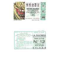 - Décimo "Extraordinario de Primavera" da Lotaría Nacional de 1979 co motivo "Sistemas de transportes": imaxe que representa un ferrocarril de cremalleira. O número do décimo é o 66031 / ANVERSO. Impresión / 66031 / Lotería Nacional. Décima parte del billete para el sorteo del día 17 de marzo de 1979 / El jefe del servicio (sinatura) / 1190609 - 066031 / 11/79 / 6ª fracción / 9ª serie / Precio 500 pesetas / Ferrocarril de cremallera (imaxe) / Sexta fracción / Fca. Nal. de Moneda y Timbre / REVERSO. Impresión / Sorteo del día 17 de marzo de 1979. Sistema moderno. Extraordinario de primavera. 9 series de 80.000 billetes de 5.000 pesetas. (Resumo de premios) / Extracto de la instrucción de Loterías (texto) / Próximo sorteo: 24 de marzo. Billetes de 2.000 ptas., en décimos de 200 ptas