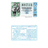 - Décimo da Lotaría Nacional de 1979 co motivo "Sistema de transportes": imaxe que representa unha caravana de elefantes. O número do décimo é o 46715 / ANVERSO. Impresión / 46715 / Lotería Nacional. Décima parte del billete para el sorteo del día 31 de marzo de 1979 / El jefe del servicio (sinatura) / 1390112 - 046715 / 13/79 / 1ª fracción / 12ª serie / Precio 200 pesetas / Caravana de elefantes (imaxe) / Primera fracción / Fca. Nal. de Moneda y Timbre / REVERSO. Impresión / Sorteo del día 31 de marzo de 1979. Sistema moderno. 14 series de 80.000 billetes de 2.000 pesetas. (Resumo de premios) / Extracto de la instrucción de Loterías (texto) / Próximo sorteo: 7 de abril. Billetes de 2.000 ptas., en décimos de 200 ptas