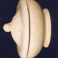- Sopeira cor branco-crema (Cream-ware), de forma ovalada, con dúas asas laterais. A tapadeira presenta remate ou pomo en forma de froita (pera) e está rodeado de follas en relevo que constitúen o centro da tapa e a parte máis elevada desta. Presenta unha "S" gravada na base.
