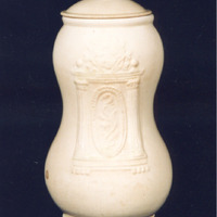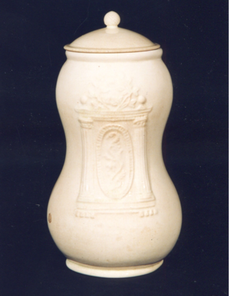 Bote de farmacia de forma cilíndrica, entallado na parte central o que facilita o seu manexo. A boca remata nun rebordo ou labio. Tapadeira de introdución interna con remate en forma de piña.
