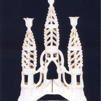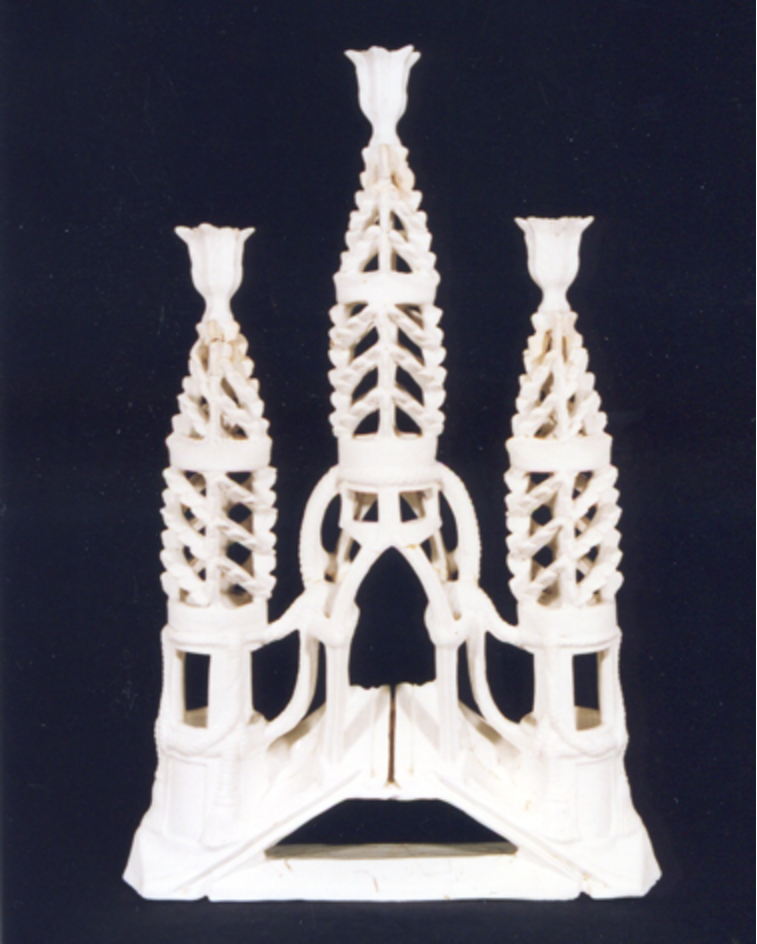 - Candeeiro de tres brazos, en cor branca, en forma de tres torrecillas caladas de influencia gótica, unidas entre si por un cordón, atado simetricamente que remata en dúas borlas. En cada vértice das torres hai un tulipán para suxeitar as velas.