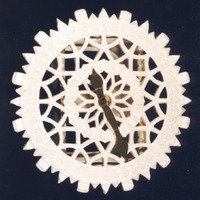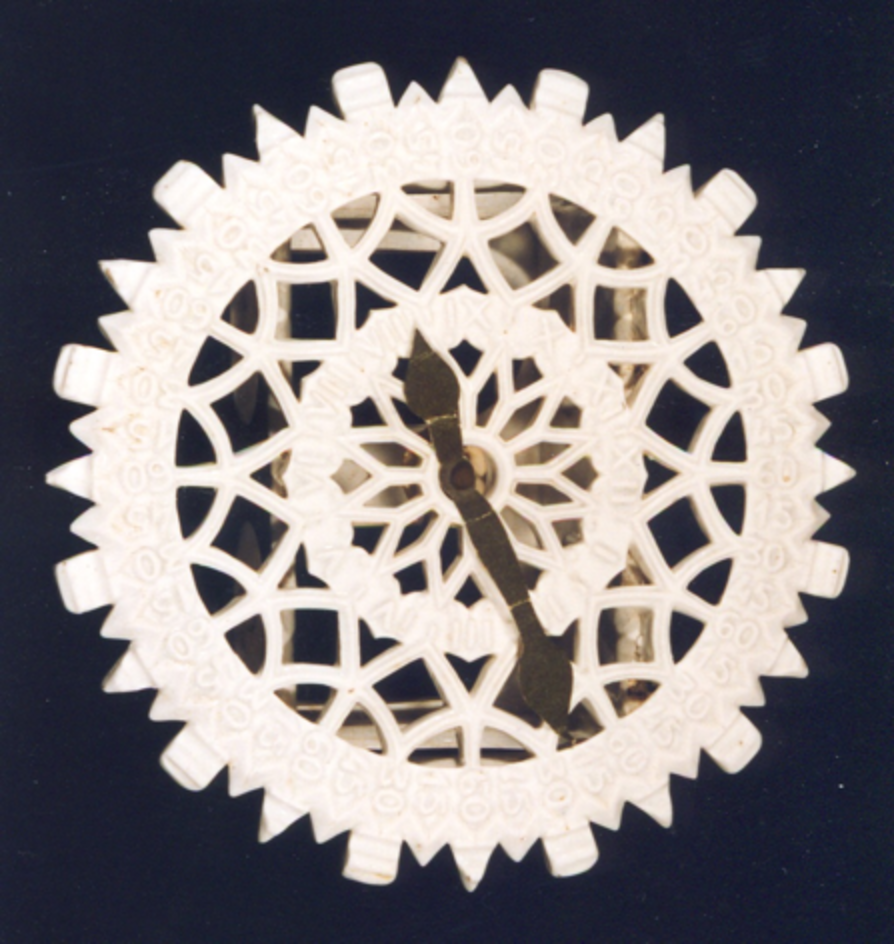 - Esfera calada de reloxo de louza de cor branca, con caixa na parte posterior para a maquinaria. Presenta un aro cos números romanos en relevo e outro aro concéntrico, no bordo, con numeración de minutos de quince en quince: 15-30-45-60. Ao bordo, decoración recortada en picos alternando con ameas.