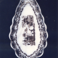 Rabanera en forma de cuncha, alongada, con relevos florais na parte máis estreita e decoración con estampaxes en negro.