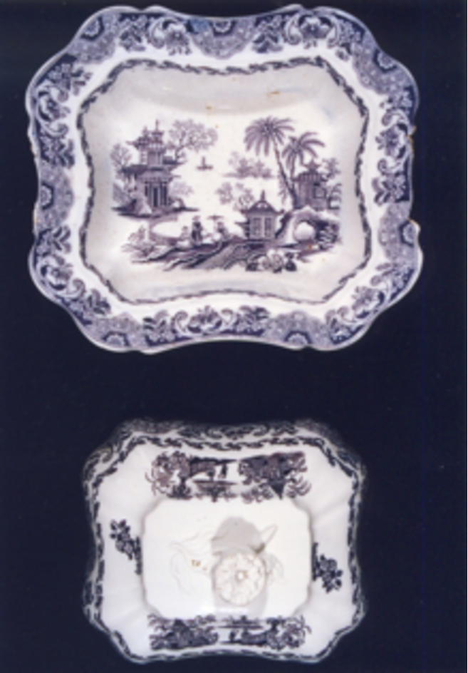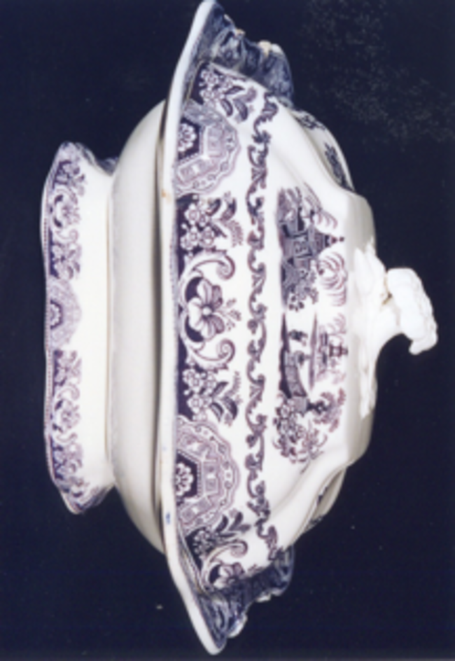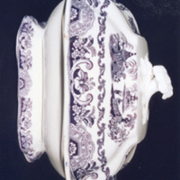 Decoración estampada en violeta consistente en paisaxes imaxinarias chinescas no fondo e dúas máis pequenas na tapadeira. Completa a decoración dous ramos de rosáceas na tapa, e orla con motivos chineses alternando con flores na tapadeira e recipiente.