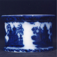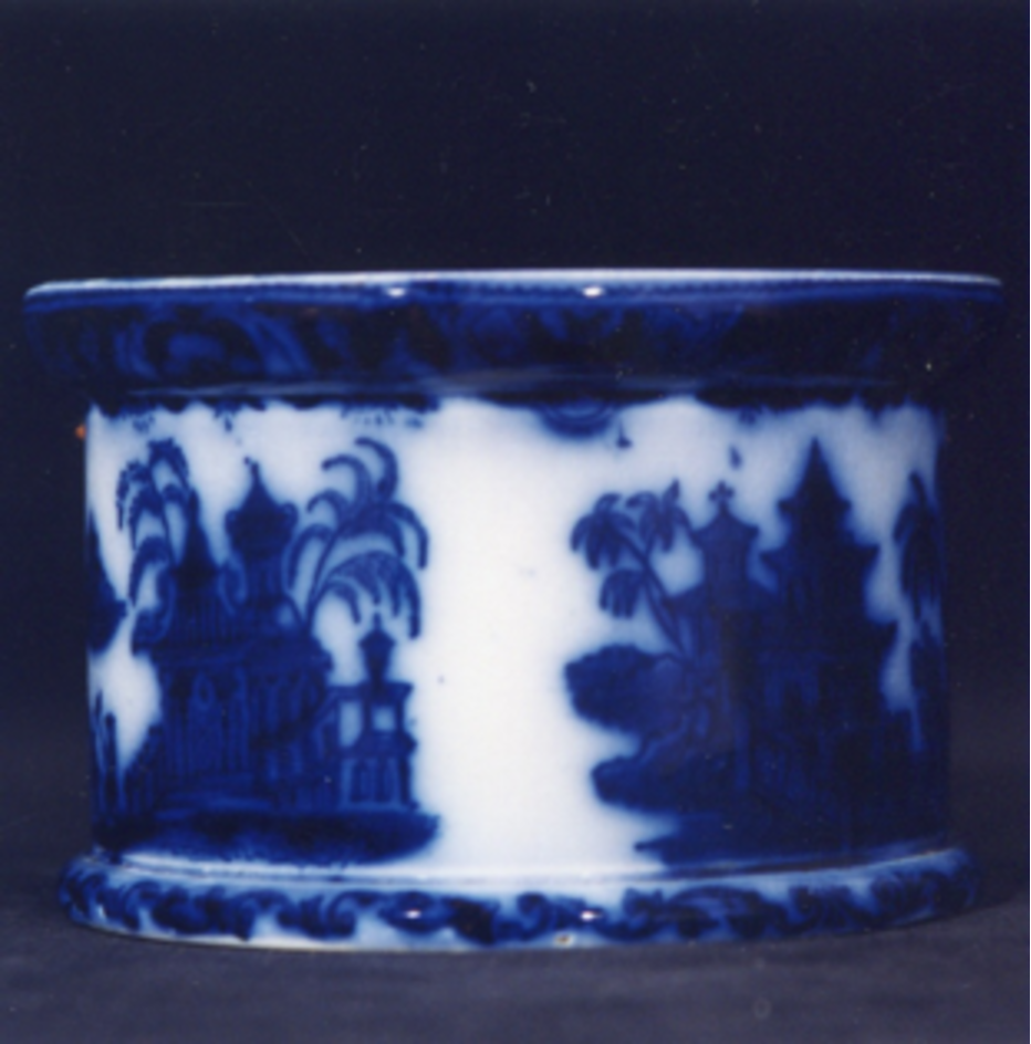 Caixa de forma cilíndrica con dúas molduras, unha inferior e outra superior. Decoración estampada en azul cobalto.