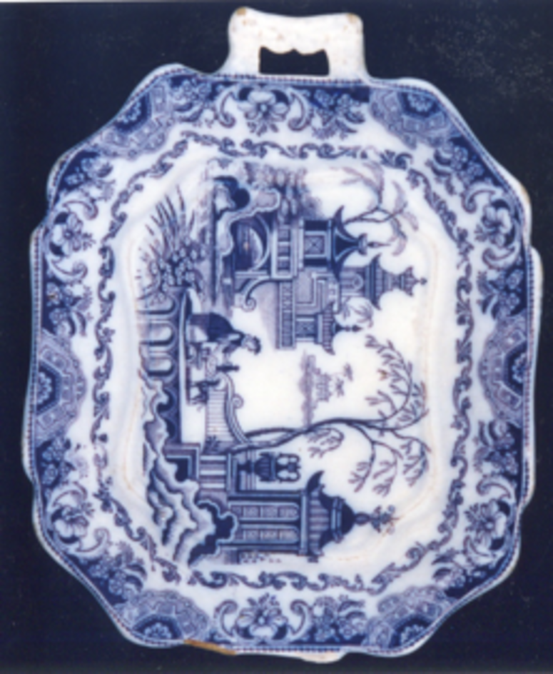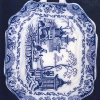 Ocupando todo o centro unha viñeta con paisaxe imaxinaria de tipo chinesco, caracterizado pola presenza de determinados elementos: pavillóns, salgueiros, rocallas, palmeiras. En primeiro plano, unha muller prepara o té ante a mirada do seu can.