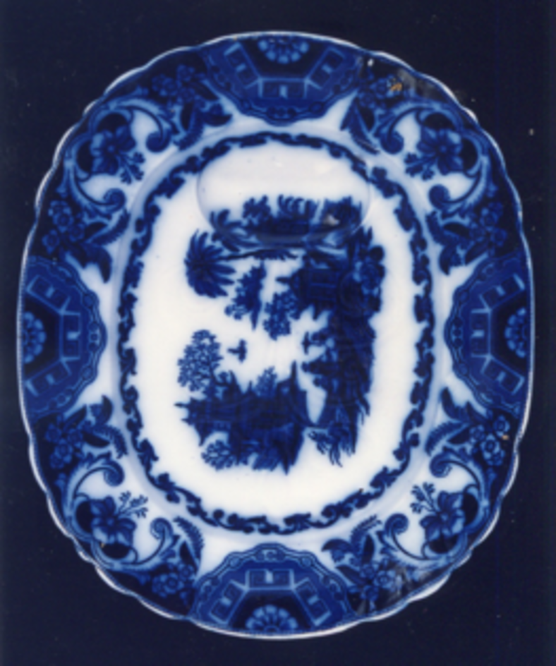 Fonte con pozuelo para recoller as salsas, bordo de ondas e estampaxes en azul cobalto difuminado.