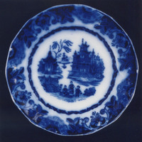 - Prato chairo con bordo poligonal. Decoración principal: no centro do prato, viñeta decorativa tipo "xardín chinesco imaxinario". É unha variante do "willow pattern" inglés. Composición marcadamente escenográfica na que aparecen tres personaxes en primeiro plano, escalinatas, pontes, río en zig-zag entorno ao cal se ordenan unha serie de pavillóns, un salgueiro, unha pequena embarcación e unha illa ao fondo. Os límites da representación non aparecen delimitados. Na bufarda, orla chinesca e orla de roleos.