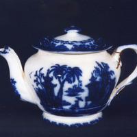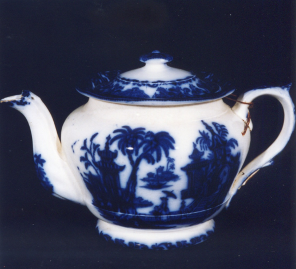 Teteira de forma redondeada con tapa con pomo en forma de botón. Decoración estampada en azul cobalto esvaído.