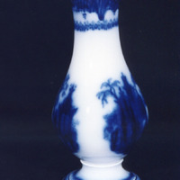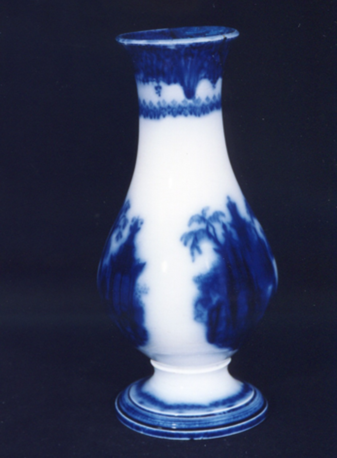 Floreiro de base circular e corpo bulboso, decorado por estampación en azul cobalto fundido. O tema principal redúcese a dúas viñetas no bandullo, que representan dúas paisaxes chinescos, xardíns con pavillóns, salgueiros, palmeiras... moi esvaídos polo que non se aprecian os detalles. Estas viñetas posúen un marcado carácter escenográfico e carencia de marco. O modelo procede do inglés "willow pattern".