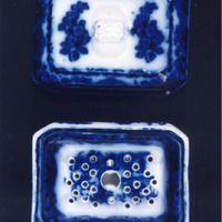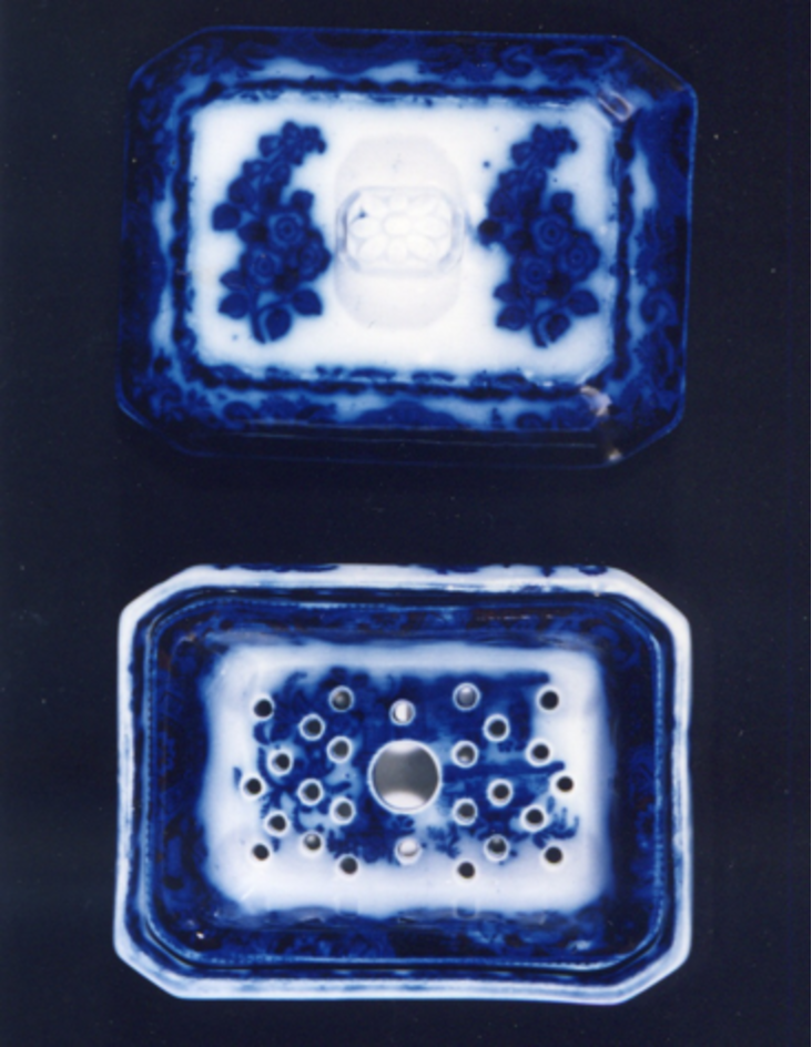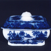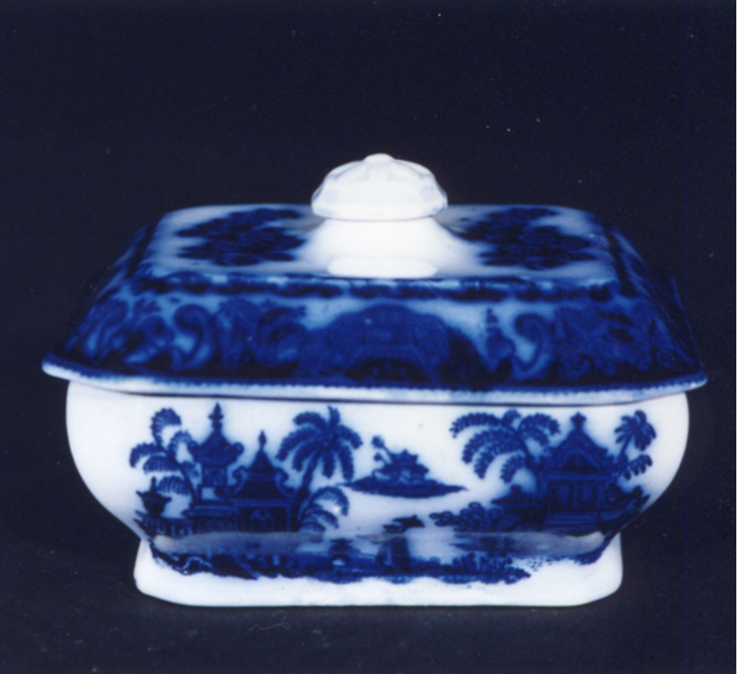 Decoración estampada en azul cobalto esvaído. O tema principal sitúase nos dous lados maiores do recipiente: son dous xardíns imaxinarios chinescos cos seus pavillóns, personaxes, palmeiras, o río, salgueiros e floreiros. O modelo procede do "willow" inglés. Son dúas viñetas que carecen de marco e teñen carácter escenográfico. Na tapa, orla chinesca ao igual que no bordo da xaboeira e a espumadeira. Parte superior da tapa, a ambos os dous lados do pomo (con relevo floral), dous ramitos de flores.