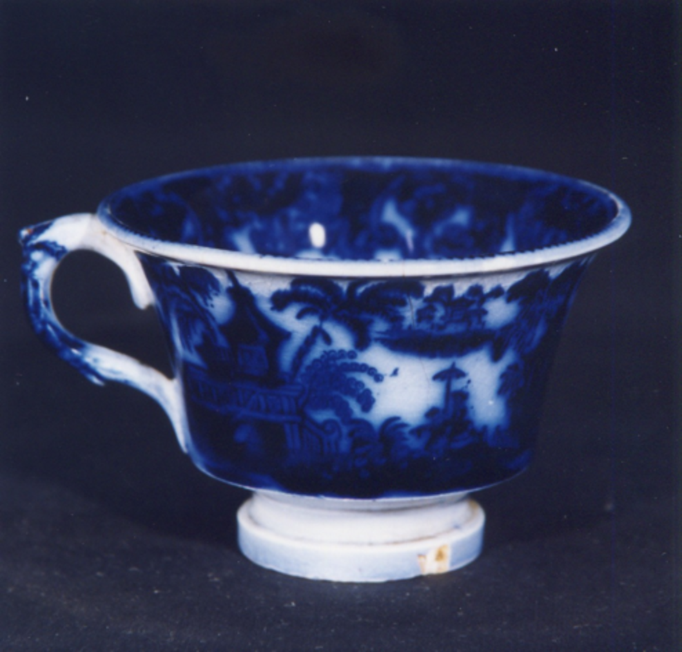 Cunca de té. Decoración estampada en azul cobalto moi esvaída.