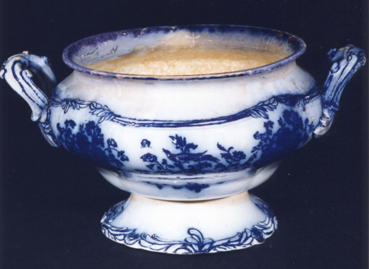 - Sopeira de forma e base redondeada, con dúas asas laterais con relevos vexetais, tanto estes como a orla que separa o colo do bandullo coma o bordo do pé, que posúen os mesmos relevos, están marcados a pincel en azul cobalto igual que as estampacións que se localizan no bandullo: tres grupos de flores e aves do paraíso en cada lado. Nestes conxuntos, de carácter chinesco, vese a asimilación de formas chinescas con formas europeas como son os roleos.