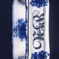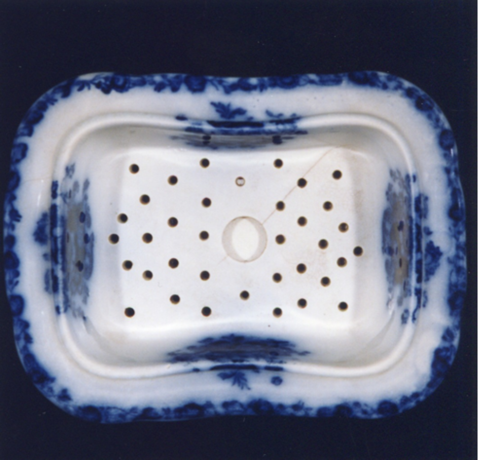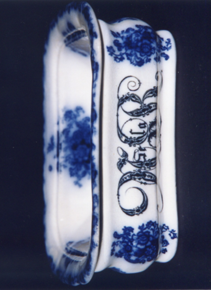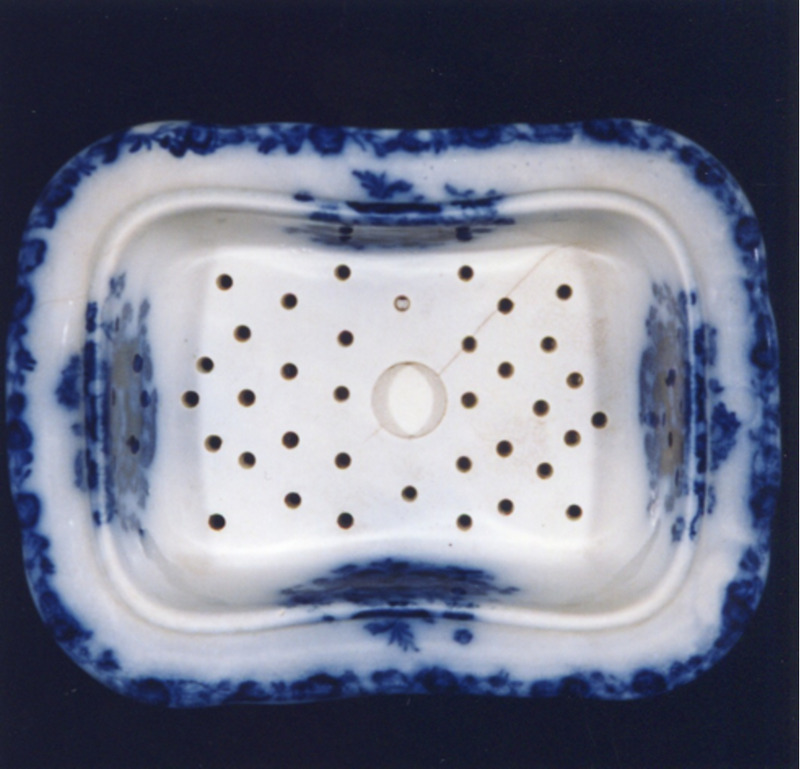 Xaboeira de dúas partes: contedor e espumadeira (falta a tapa). Decoración estampada en azul cobalto esvaído e negro.