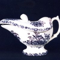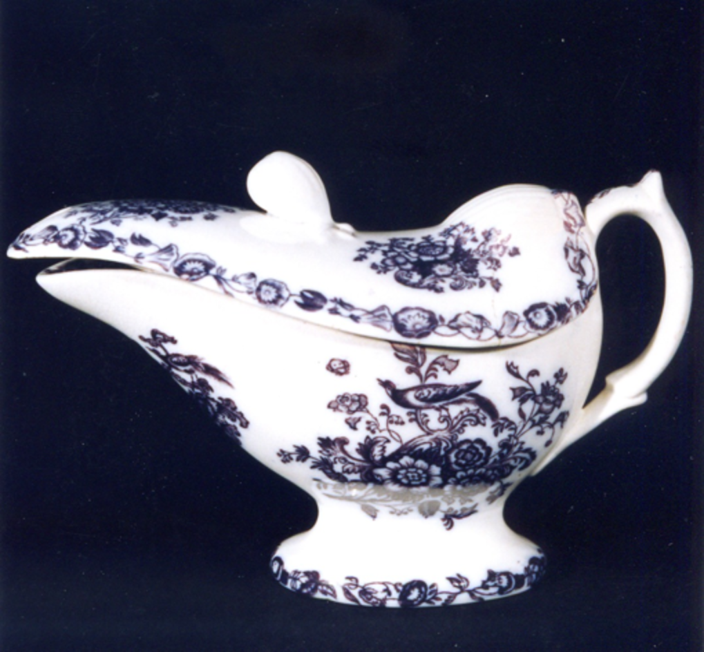 Salseira "de pico" con tapa, forma herdada da prataría. Decoración estampada en azul violáceo.