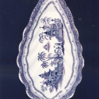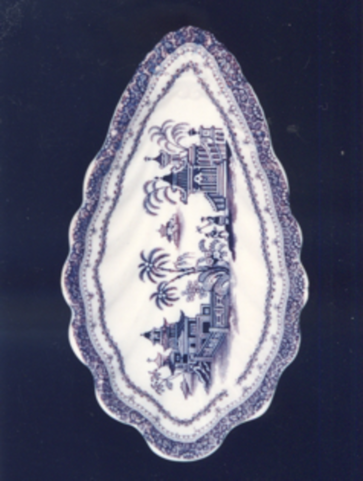 Fonte para entremeses en forma de cuncha, con relevo, na parte máis estreita, de flores e follas.