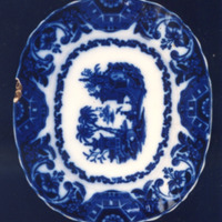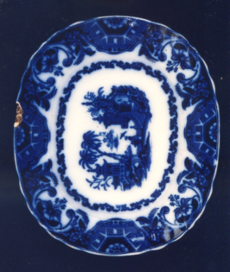 Fonte ovalada chaira con bordo de ondas e estampaxes en azul cobalto difuminado.
