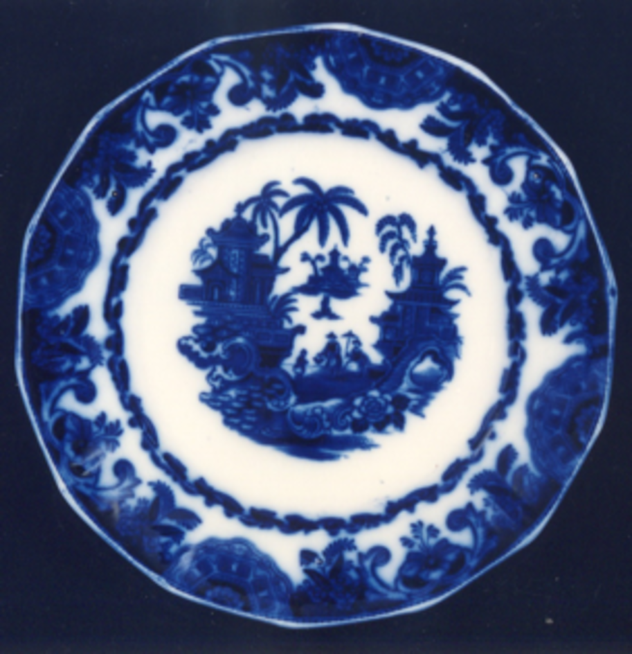 Prato chairo de bordo poligonal e decoración estampada en azul cobalto.