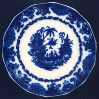 O tema principal é unha viñeta con paisaxe chinesco, imaxinario: con pagodas, palmeiras, río, rocallas barrocas, embarcación... Completa a decoración unha cenefa ao bordo, nas guardillas, alternancia de motivos chinescos e flores. Acompaña a esta unha orla de roleos.