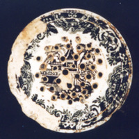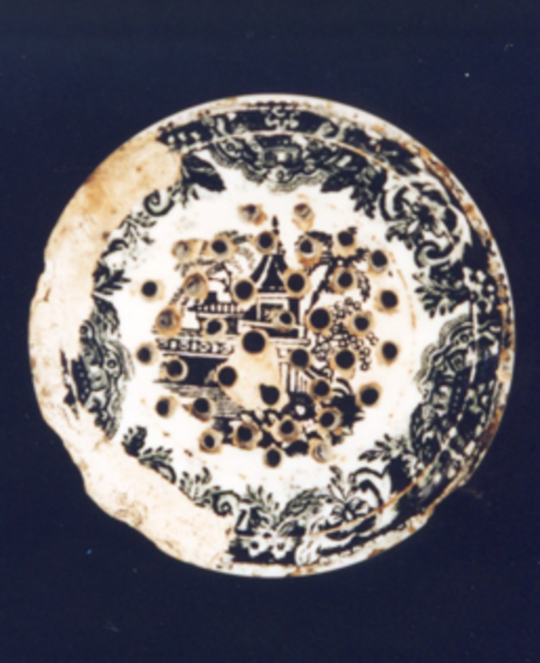 Na parte superior (furada para a saída de areas), fragmento dunha viñeta con paisaxe chinesca, enmarcada por orla característica chinesca.