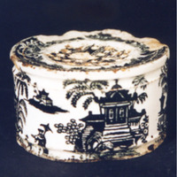 Salvadeira de forma cilíndrica, moldurada, con estampaxes en cor negra.