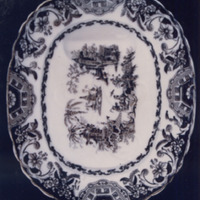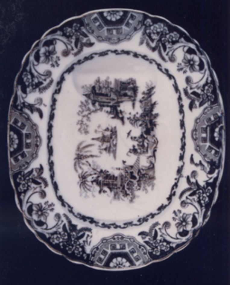 No centro, tema principal, procedente do "willow patteru" inglés: Viñeta onde se reproduce un xardín imaxinario chinesco con pavillóns, rocalles, palmeiras, illotes ordenados ao redor dun río en zig-zag.