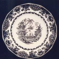 O tema principal, no centro, representa unha paisaxe imaxinaria tipo chinés, con pavillóns, palmeiras, salgueiros, rocallas...