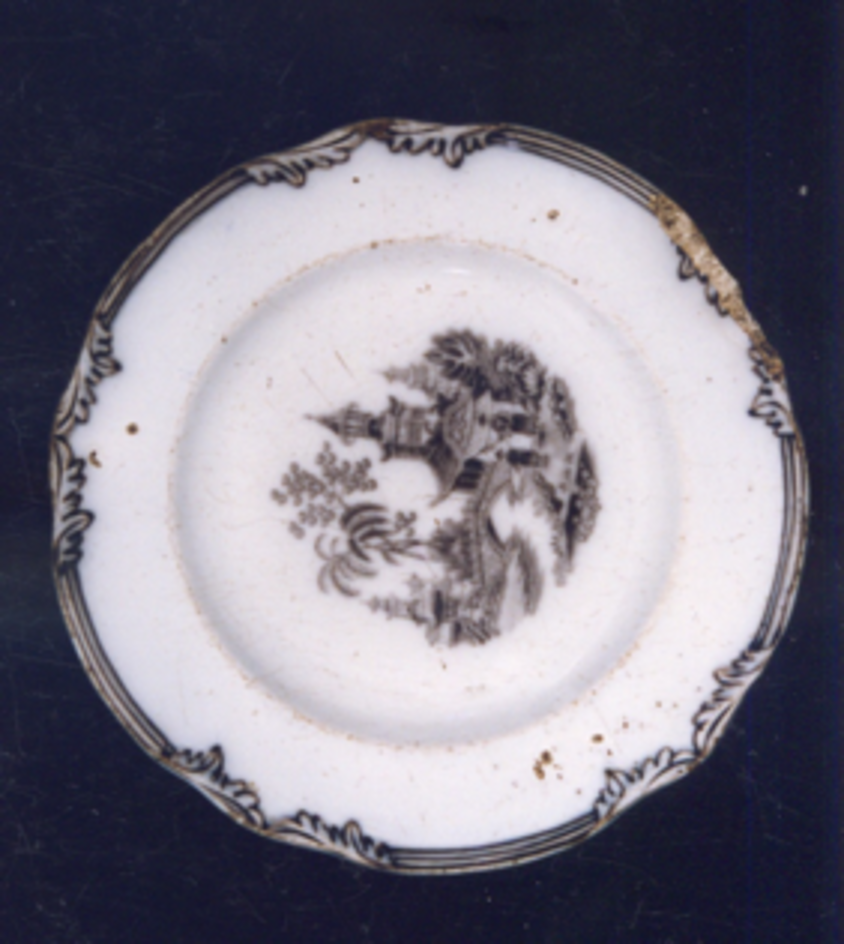 O tema principal, estampado en negro, localízase no centro: é unha viñeta con xardín fantástico chinesco (pavillóns, palmeiras, ponte, río y chinos)