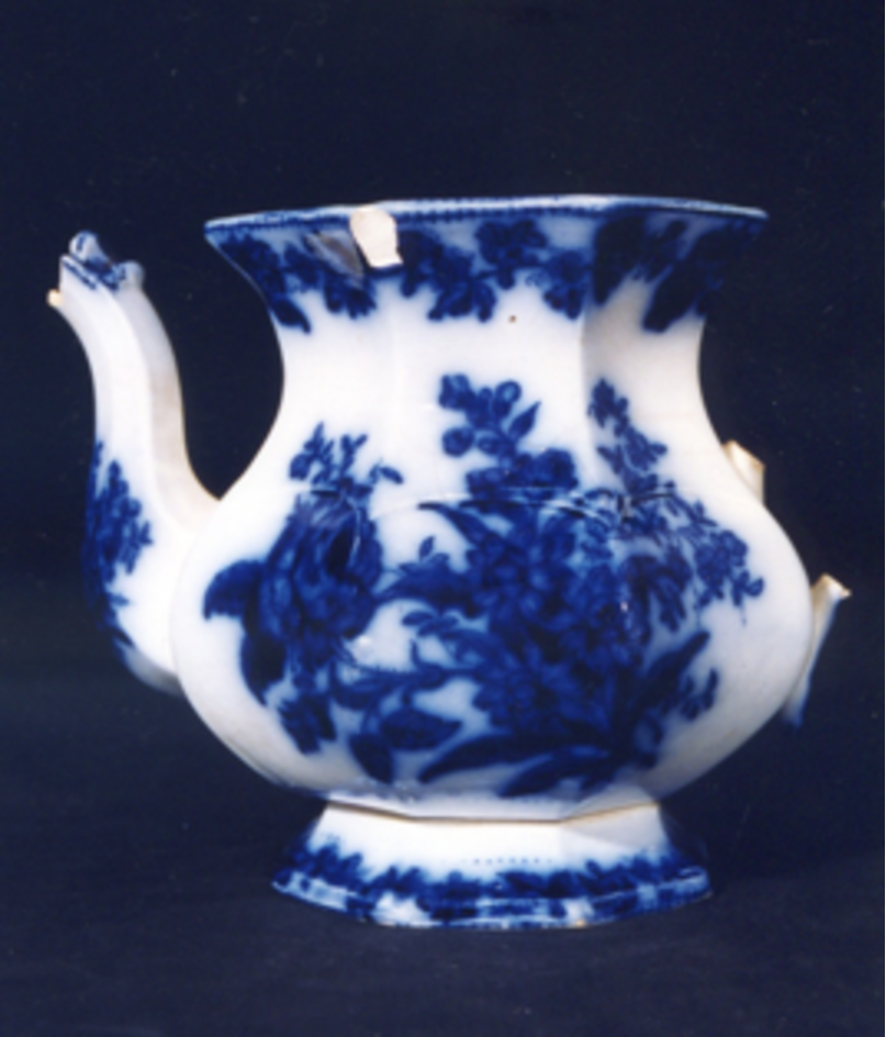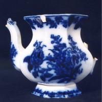 Teteira labeada, de base poligonal, sen asa nin tapadeira. Decoración estampada en azul cobalto difuminado.