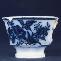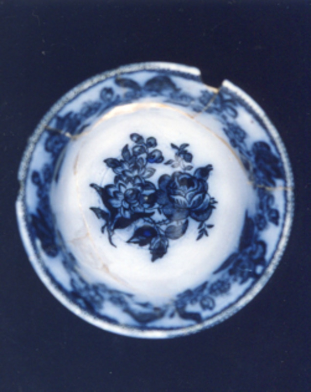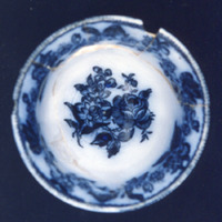 Cunca de té moi deteriorada e sen asa. Presenta decoración estampada en azul cobalto e impregnación do fondo de cor.