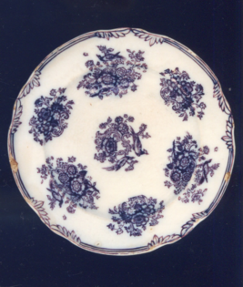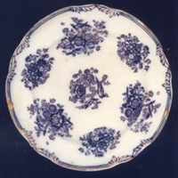 Prato chairo con decoración vexetal en relevo no bordo, seguida a pincel azul violáceo do mesmo xeito que as estampaxes.