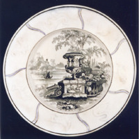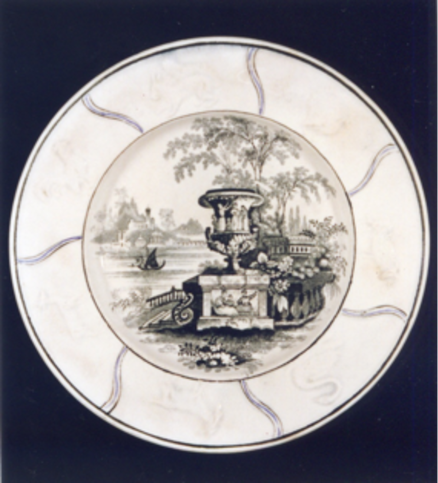 No centro decoración estampada en negro dunha paisaxe imaxinaria tipo "Góndola" caracterizada pola existencia dunha gran floreiro clásico en primeiro termo, balaustres, río con góndola, ponte e edificacións clásicas.