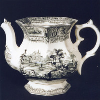 Teteira labiada, de molde, de base octogonal. Decorada con estampados en negro.