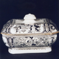 Caixa para xabón sen espumadera, de forma rectangular con remate na tapa de relevo de flor. Estampados en negro.