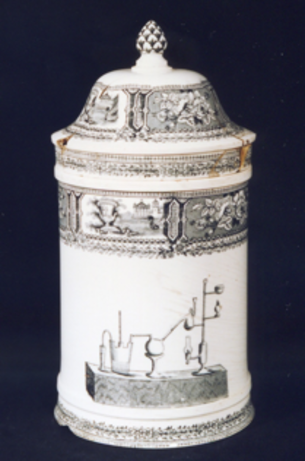 Bote de forma cilíndrica con moldura na parte superior e inferior. O motivo principal é unha base sobre a que están uns matraces e alambiques cunha resistencia.