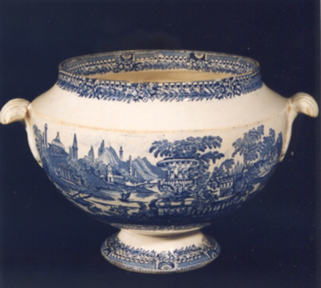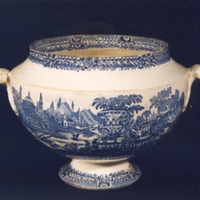 Sopeira de forma redonda, con pé alto e dúas asas laterais en forma de venera.