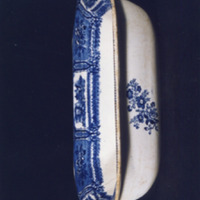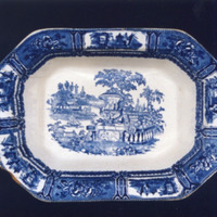 Fonte fonda, cuadrilonga con decoración estampada en azul cobalto.
