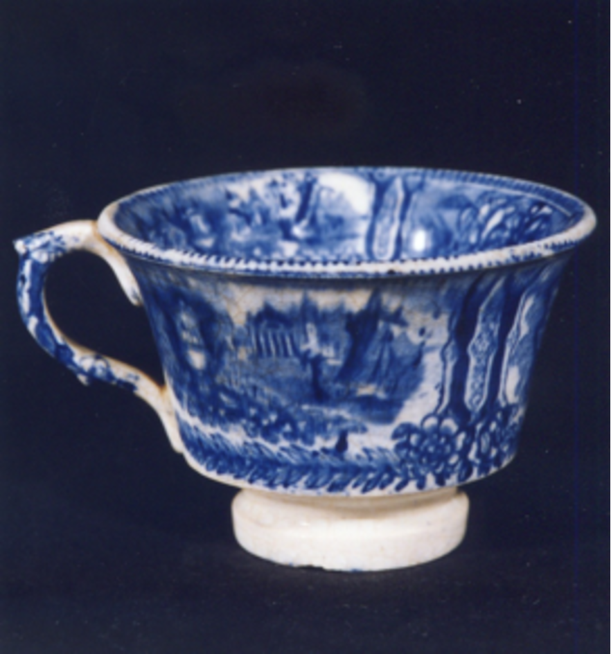 Cunca de té con decoración estampada en azul cobalto fundido.