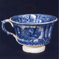 Decoración a base de viñetas con tema de paisaxe imaxinaria victoriano, con góndola, alternando con flores (rosas) no bordo interno e viñetas iguais no bandullo, ocupando toda a parte externa da peza. Asa, estampado floral.