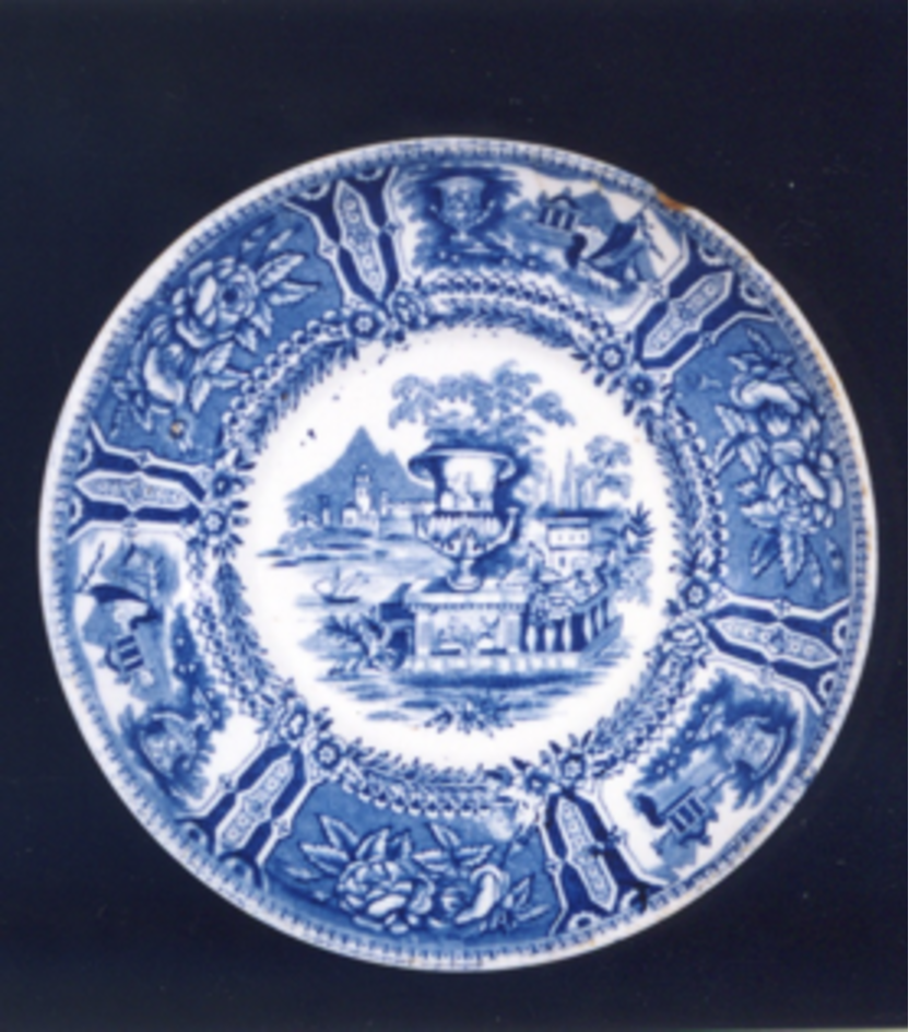 Na á do prato, alternancia de paisaxe con floreiro e góndolas e grupos de rosas.
