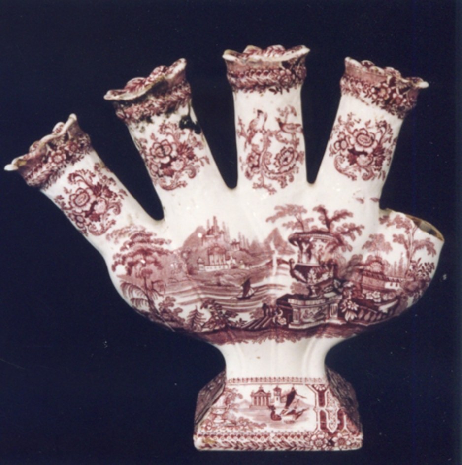 - Floreiro de cinco dedos (actualmente catro) que semella a palma da man estendida. Estampados en granate. Decoración principal: dúas vistas imaxinarias tipo "Góndola" en cada un dos lados, que ocupan o bandullo da peza. Cada un dos dedos ten o bordo en ondas, decorado con cenefa de espiquilla e rosáceas, tanto no interior como no exterior; en cada un dos dedos, dous ramos de rosáceas e roleos (chinesco) e no dedo central o mesmo ramo pero con dúas aves do paraíso. Base cuadrangular con viñetas de paisaxe "Góndola" alternando con rosas.