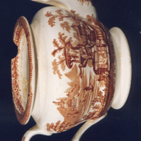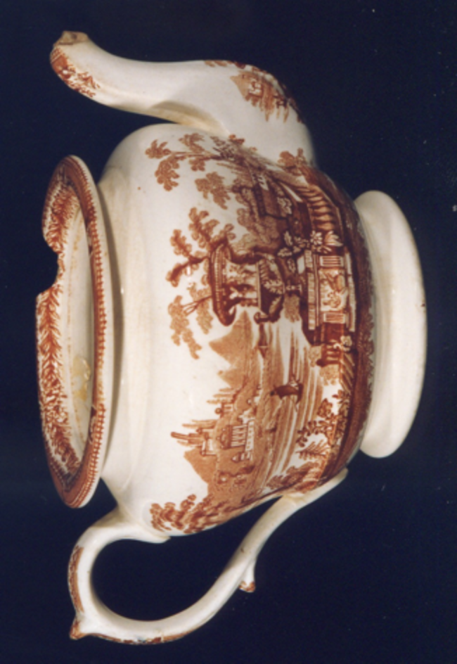 Teteira redondeada con decorados de estampaxe en cor marrón clara.